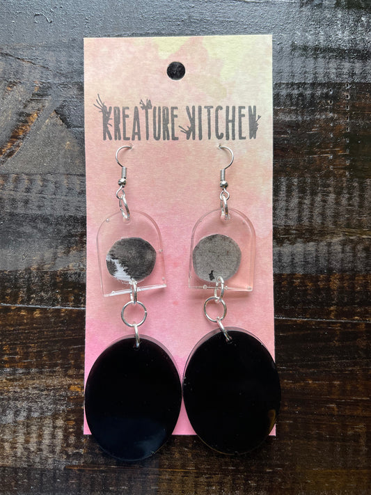 Original black ink and pen drawings on watercolor paper, encased in resin to create unique ink drawing earrings. Each drawing is unique and original (no duplicates).