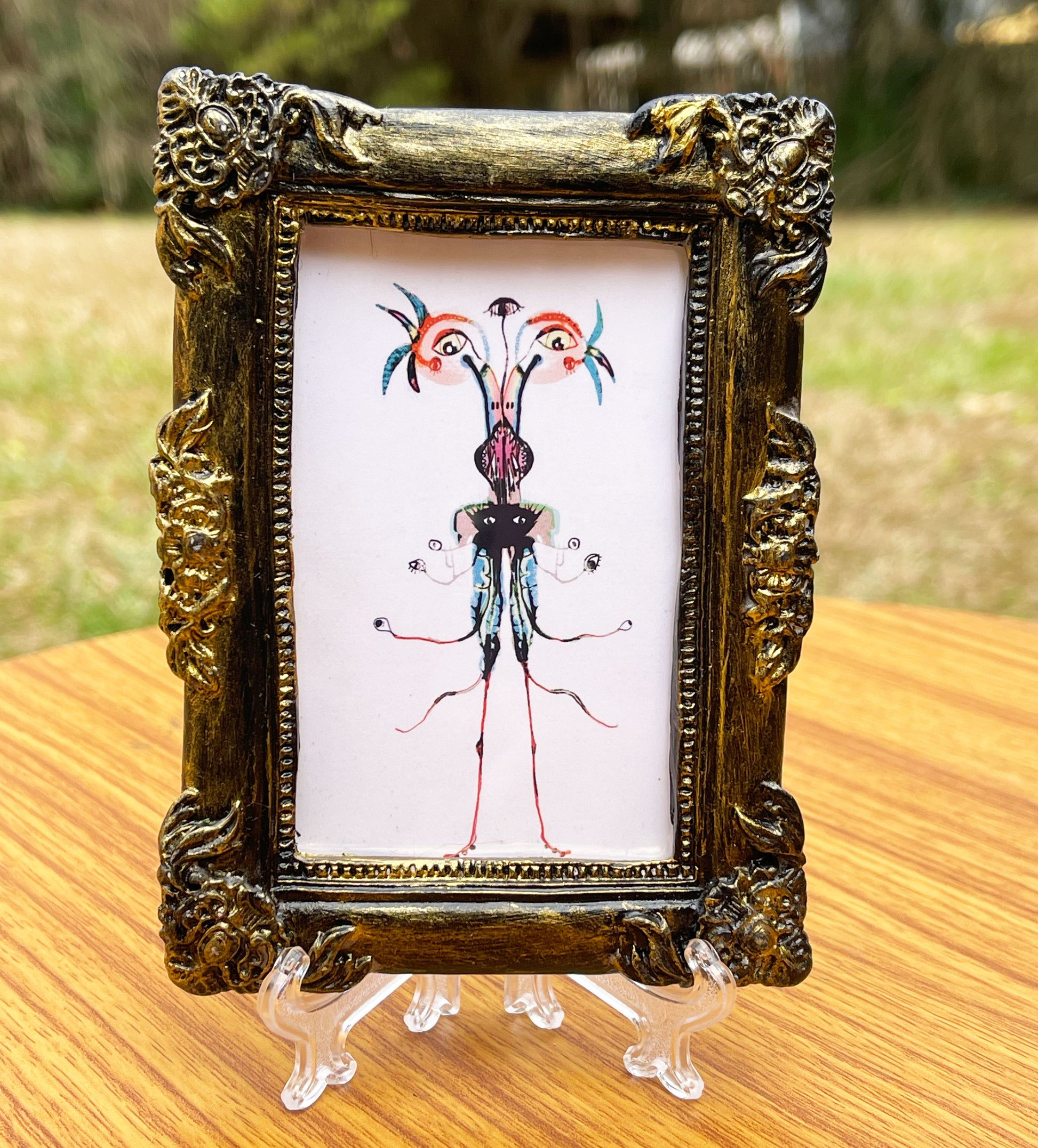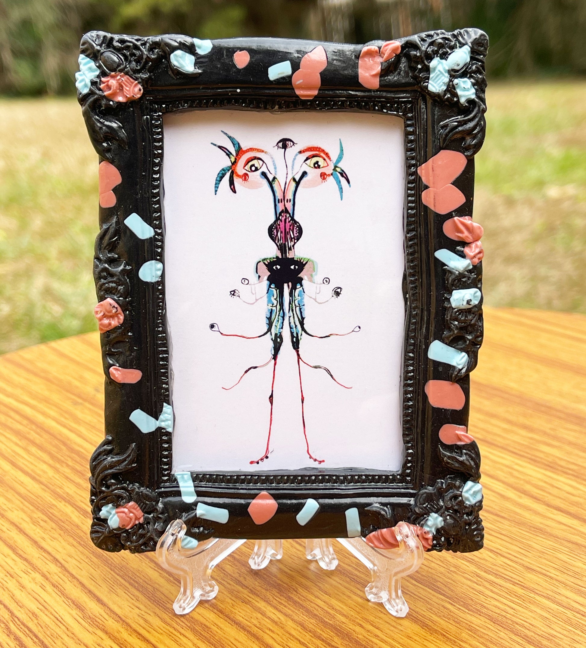 Frame: 3.5 x 4.5 inch clear glossed polymer clay frame, with a clear acetate covering.