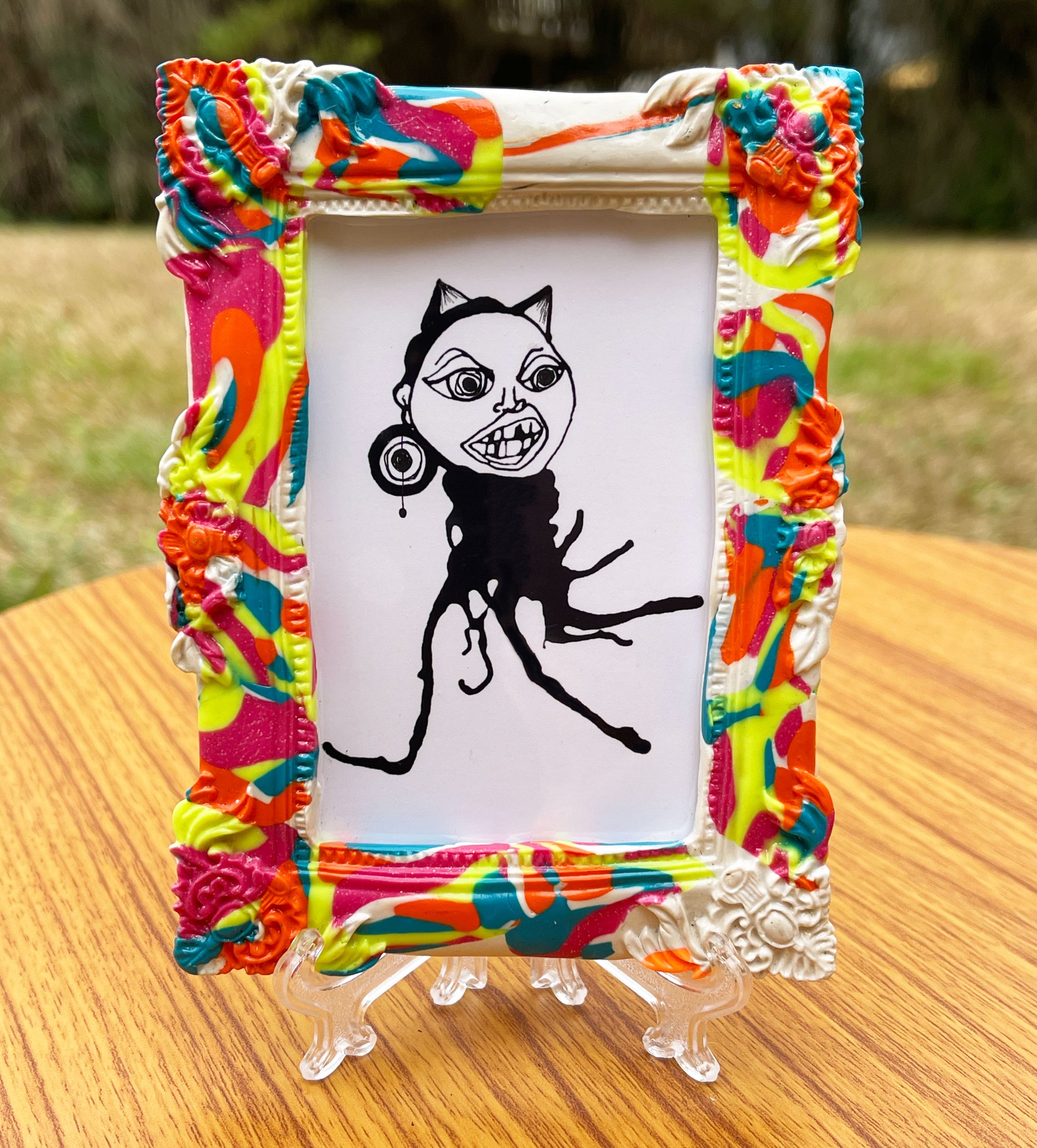 Frame: 3.5 x 4.5 inch clear glossed polymer clay frame, with a clear acetate covering.