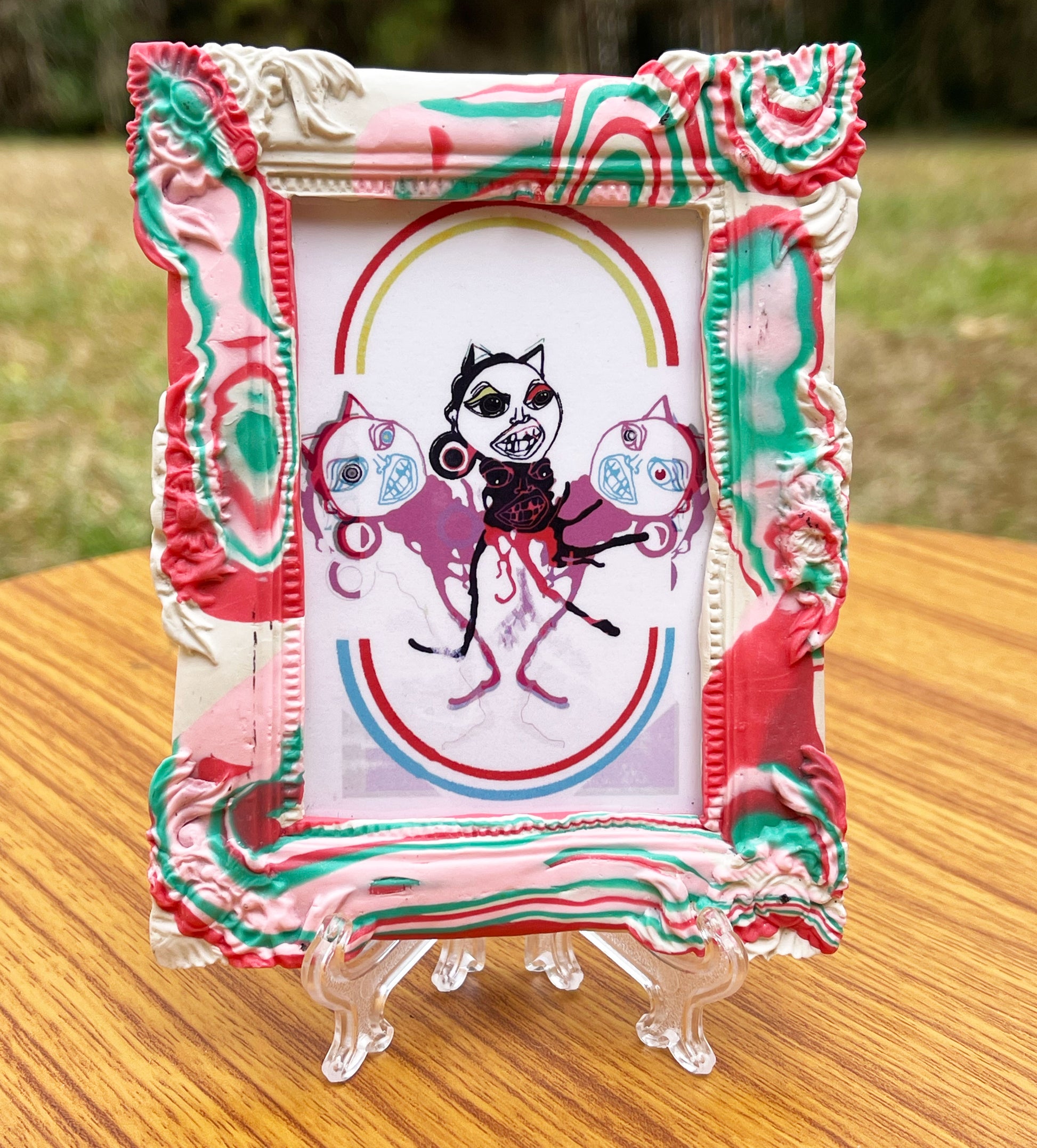 Frame: 3.5 x 4.5 inch clear glossed polymer clay frame, with a clear acetate covering.