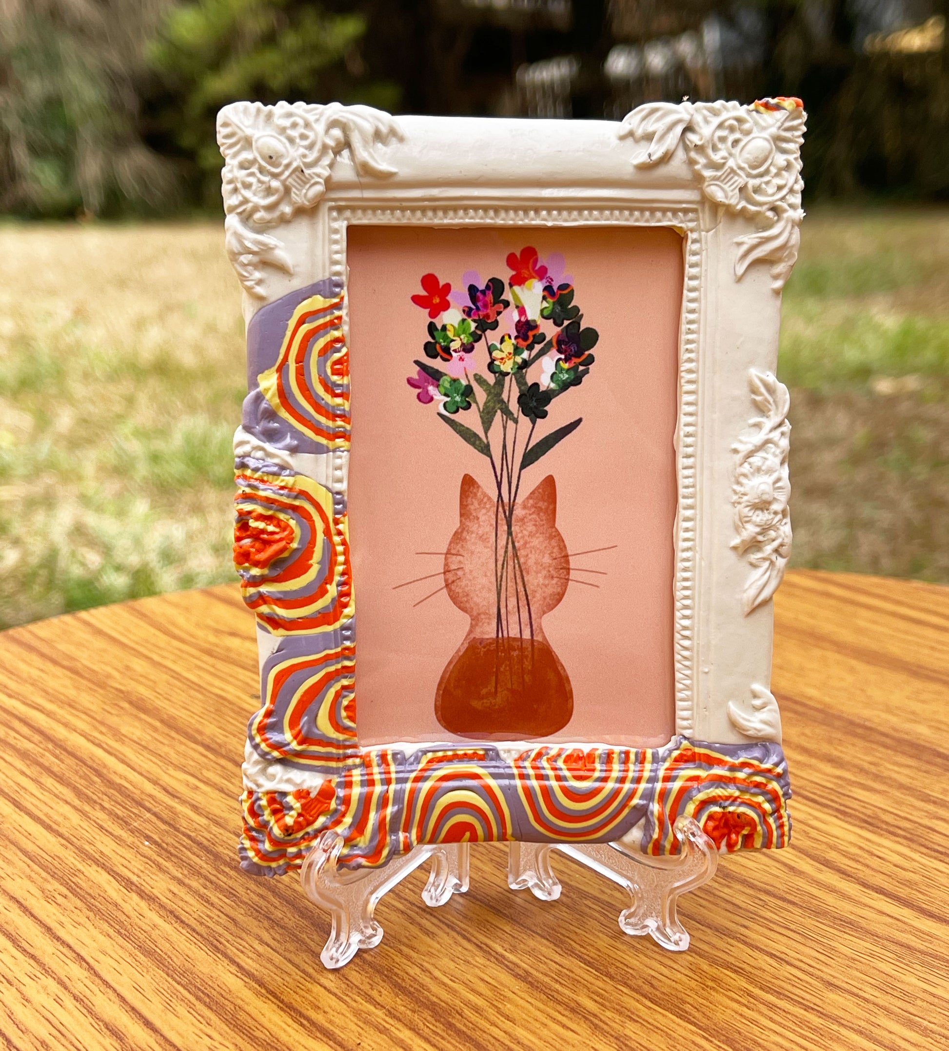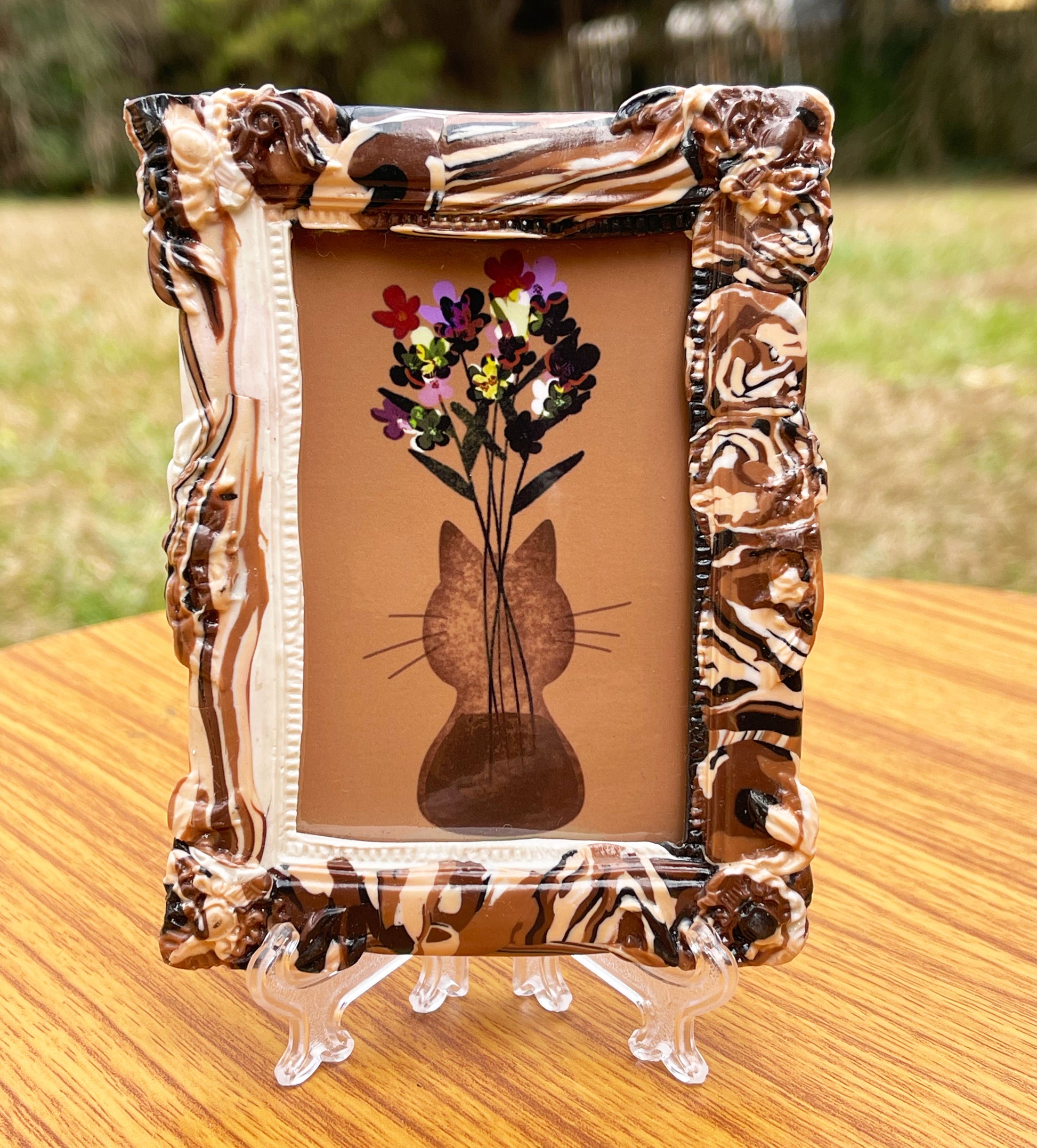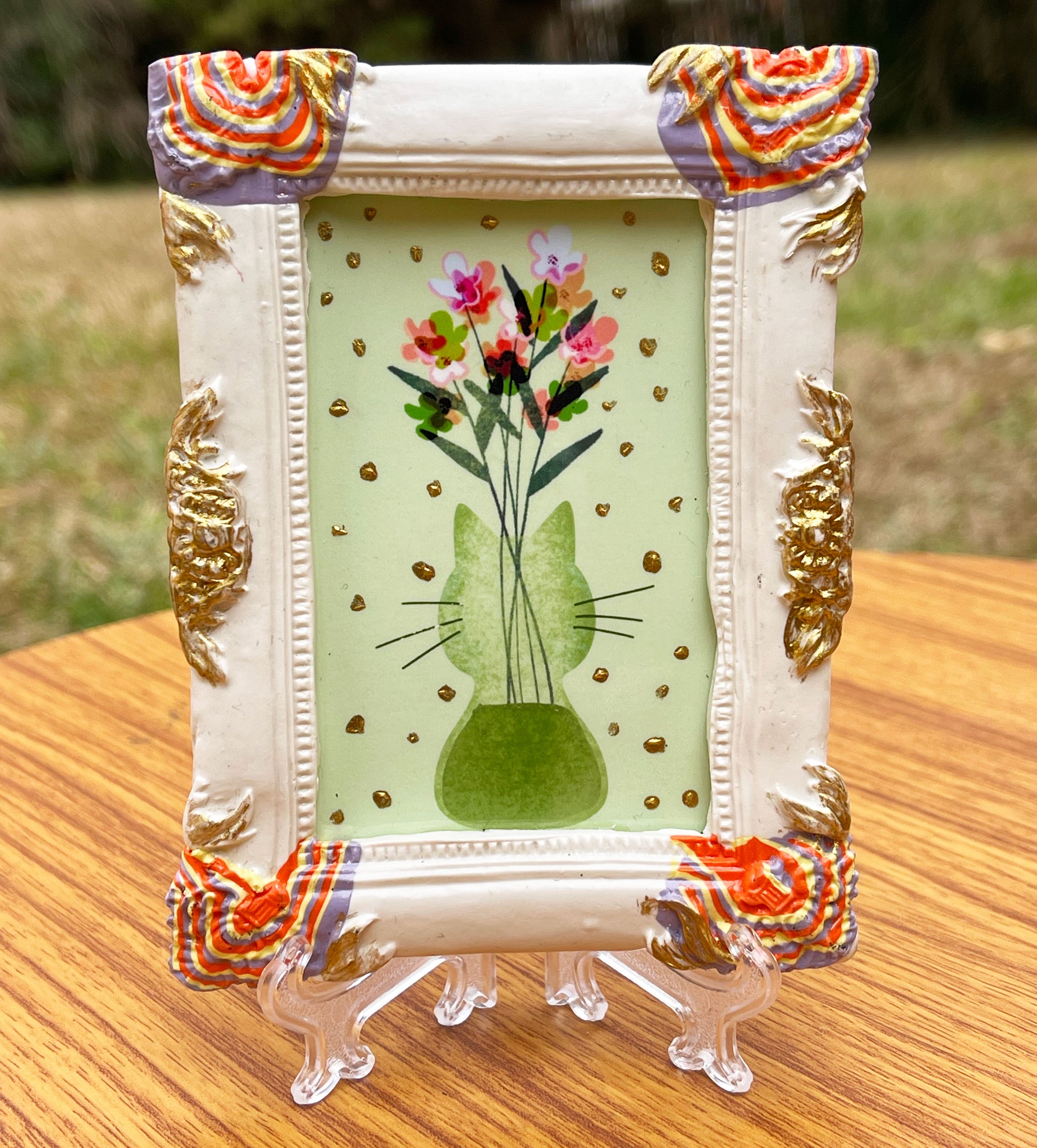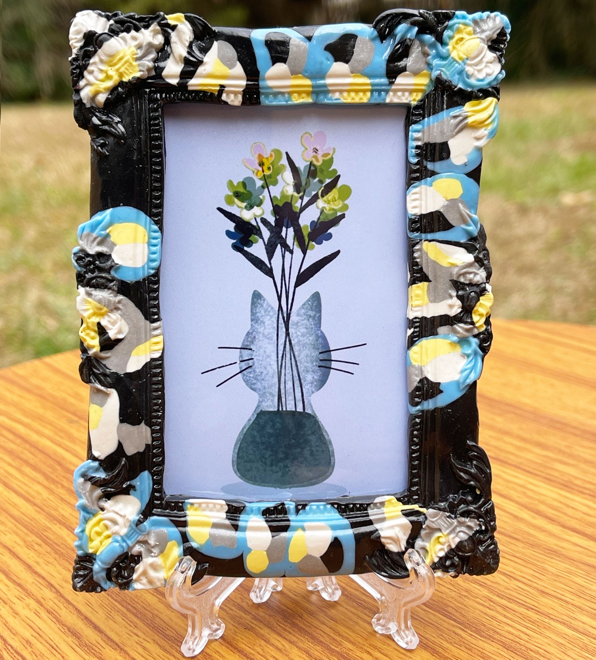 Frame: 3.5 x 4.5 inch clear glossed polymer clay frame, with a clear acetate covering.