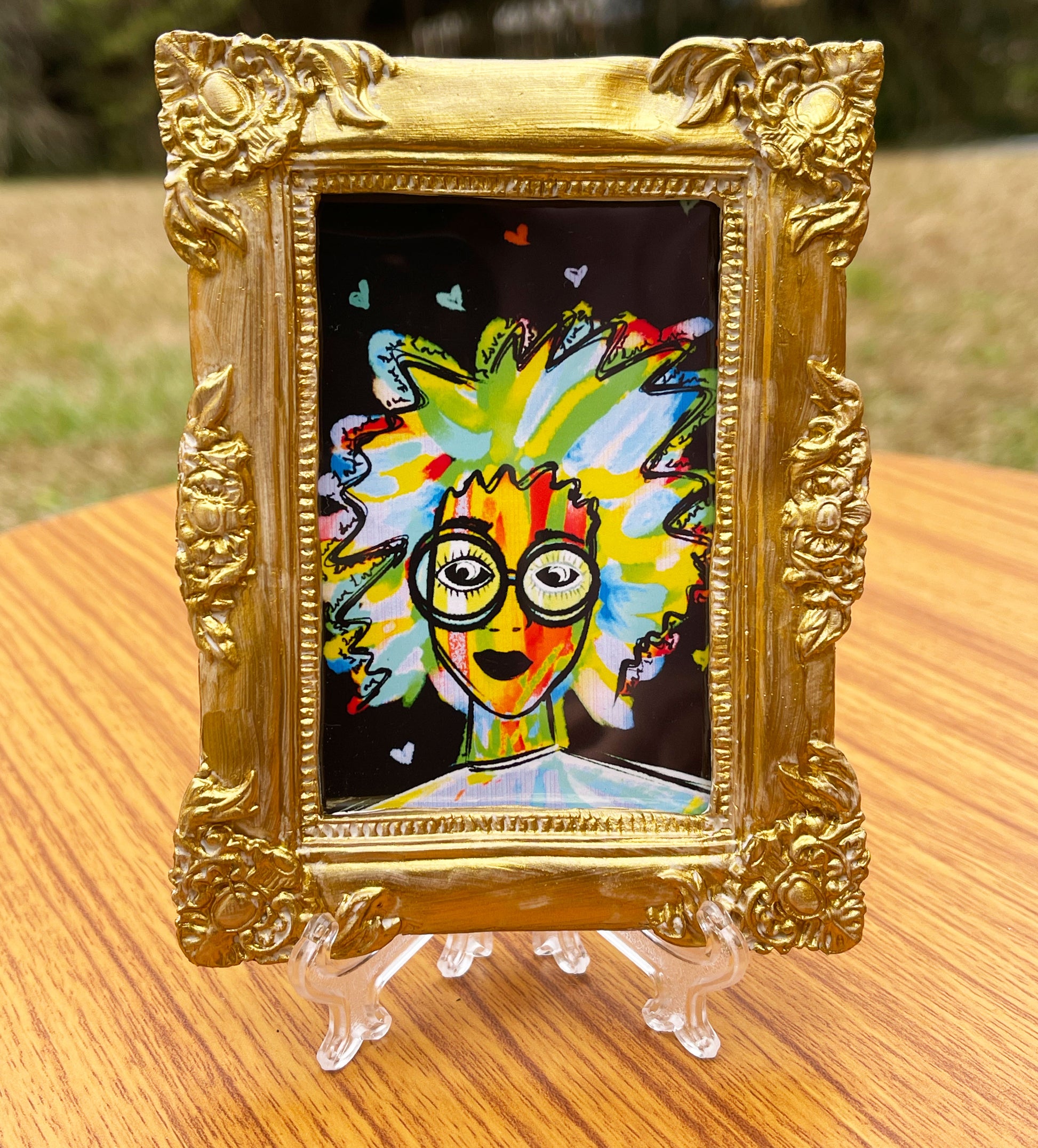 Frame: 3.5 x 4.5 inch clear glossed polymer clay frame, with a clear acetate covering.