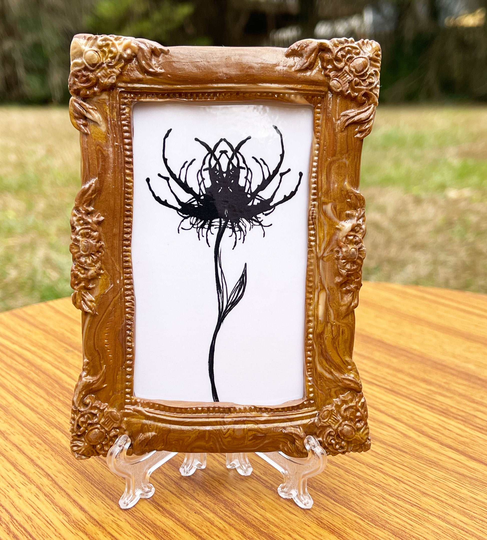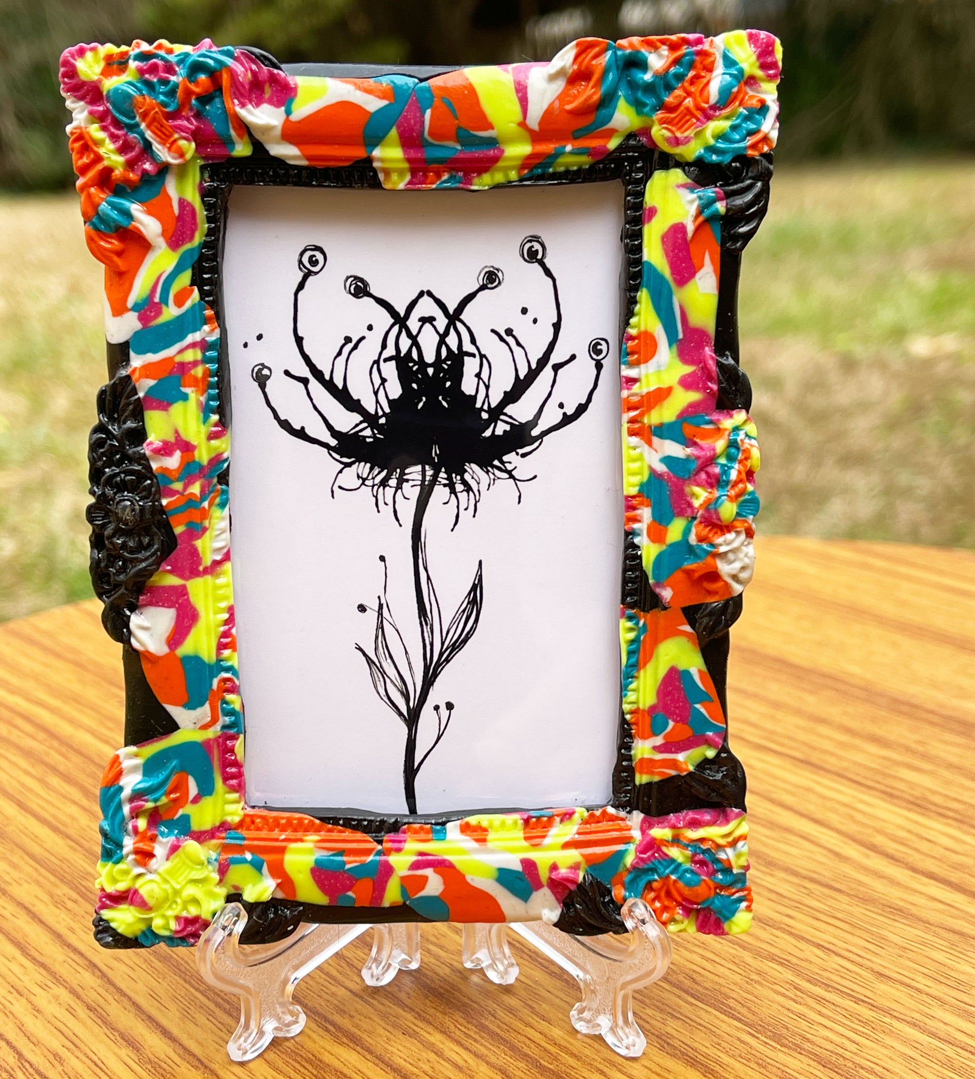 Frame: 3.5 x 4.5 inch clear glossed polymer clay frame, with a clear acetate covering.
