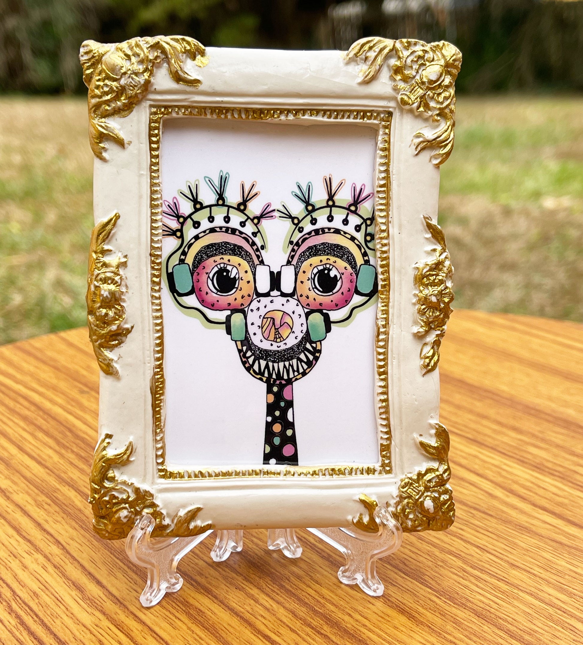 Delight in the whimsical charm of this unique artwork featuring a giraffe made out of sushi. Encased in a clear glossed polymer clay frame with a clear acetate covering, this piece blends traditional and digital mediums for a truly one-of-a-kind creation.